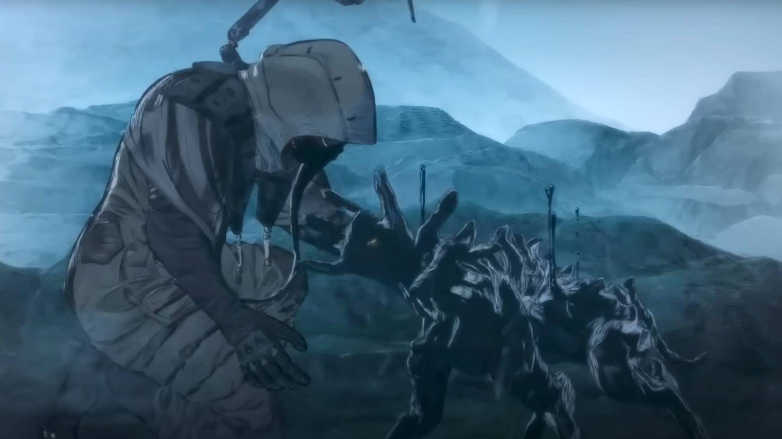 Death Stranding Mosquito trailer screenshot with unnamed protagonist caressing a BT dog Image: Kojima Productions/ABC ANIMATION via Polygon